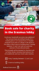Ook is er ruim de gelegenheid om kennis te maken met de vrijwilligers en meer te leren over het werk van Books 4 Life (www.books4life.nl). Books 4 Life Nijmegen is onderdeel van een landelijke organisatie die sinds 2006 tweedehandsboekenwinkels runt voor het goede doel en om boeken een tweede leven te geven en voor iedereen toegankelijk te maken. De winkel in Nijmegen draait volledig op vrijwilligers en combineert liefde voor boeken met maatschappelijke betrokkenheid.